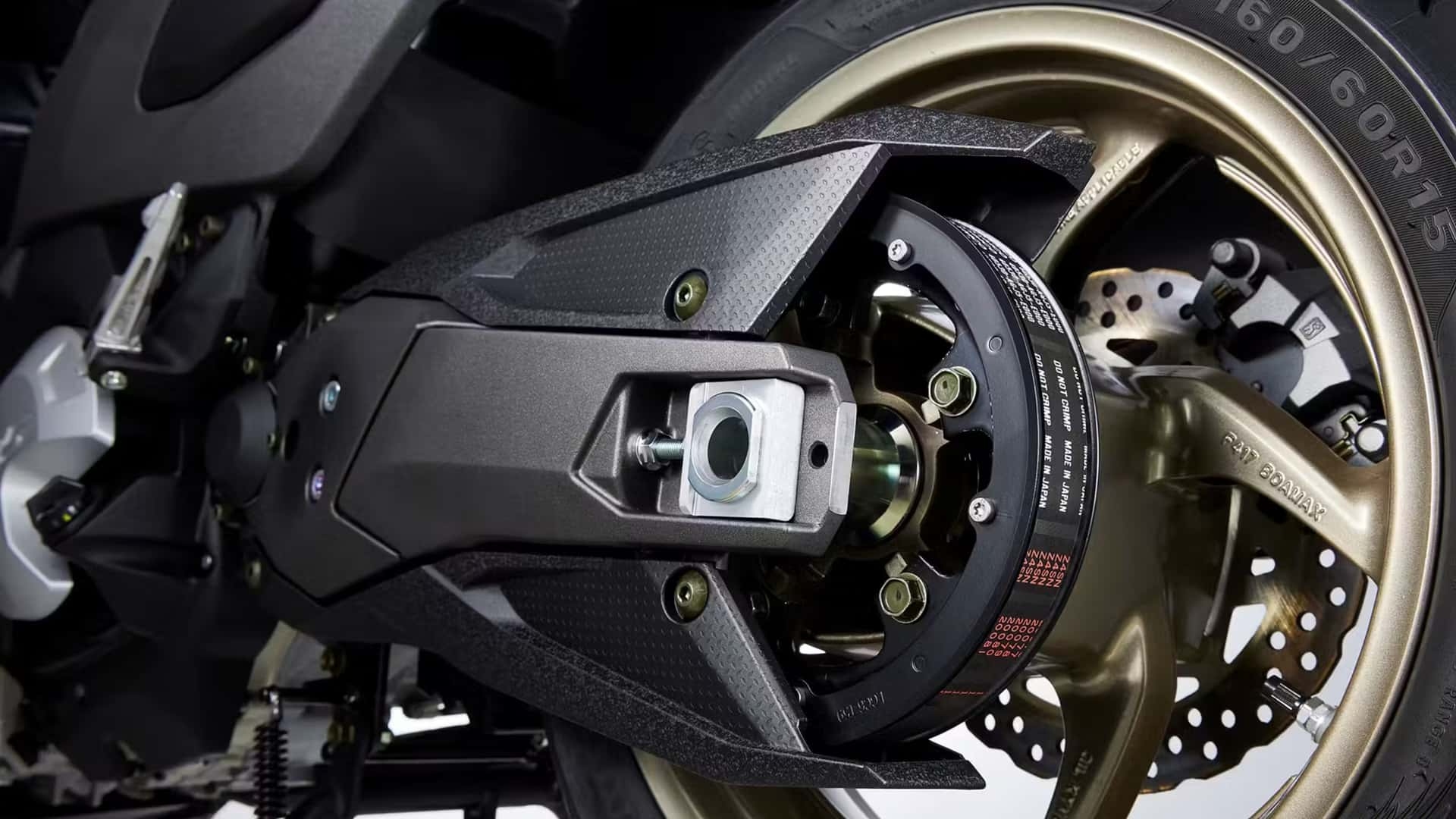 Phía sau xe tiếp tục gây bất ngờ với hộp số vô cấp CVT kết hợp cùng hệ truyền động bằng dây đai trên gắp nhôm. Việc sử dụng lốp sau cỡ lớn 160 mm cho thấy chiếc xe sở hữu những thông số kỹ thuật không thua kém gì xe máy truyền thống. Điều này đồng nghĩa với việc người dùng vẫn tận hưởng sự nhàn hạ khi chỉ cần vặn ga là chạy, nhưng sức mạnh phần cứng lại thừa khả năng để bám đuổi các mẫu xe phân khối lớn trên những chặng đường dài.